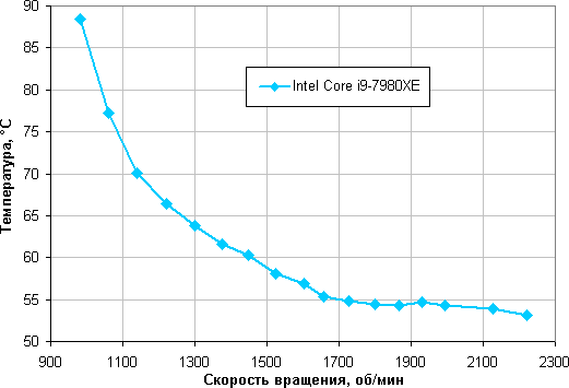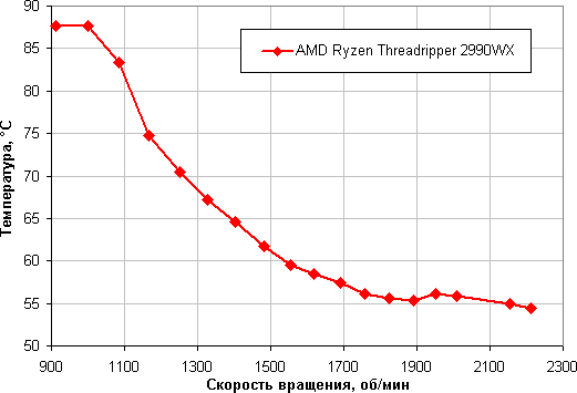 Зависимость температуры процессора AMD Ryzen Threadripper 2990WX при его полной загрузке от скорости вращения вентиляторов: