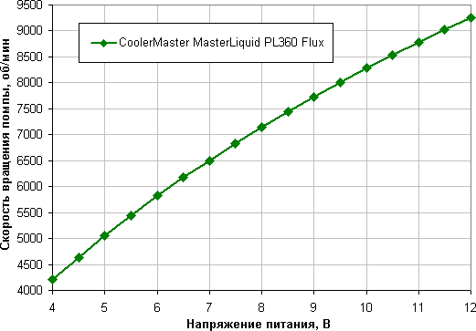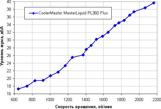 Уровень шума от этой системы охлаждения не очень высокий во всем диапазоне скорости вращения вентиляторов. Первые две точки на графике выше (скорость вращения вентиляторов менее 800 об/мин) соответствуют условиям, когда помпа еще не включилась. Зависит, конечно, от индивидуальных особенностей и других факторов, но где-то от 40 дБА и выше шум, с нашей точки зрения, очень высокий для настольной системы; от 35 до 40 дБА уровень шума относится к разряду терпимых; ниже 35 дБА шум от системы охлаждения не будет сильно выделяться на фоне типичных небесшумных компонентов ПК — корпусных вентиляторов, вентиляторов на блоке питания и на видеокарте, а также жестких дисков; а где-то ниже 25 дБА кулер можно назвать условно бесшумным. Фоновый уровень был равен 16,0 дБА (условное значение, которое показывает шумомер). Помпа работает очень тихо: