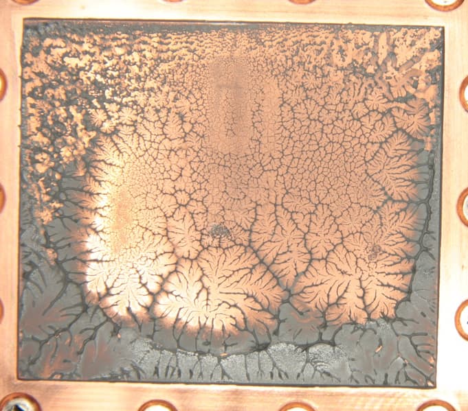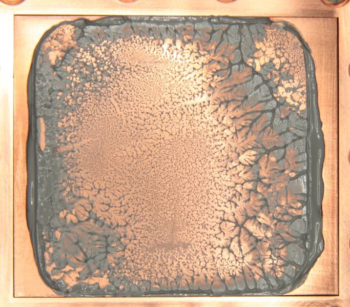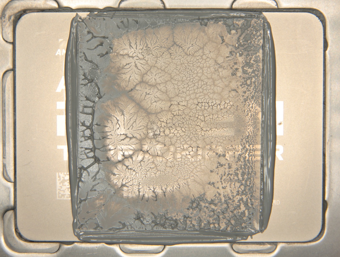 Видно, что термопаста распределилась тонким слоем на всю площади крышки процессора, а ее избытки выдавились за края. Участок плотного контакта расположен примерно по центру и имеет большую площадь. Отметим, что крышка этого процессора сама по себе чуть выпуклая к центру. (Распределение термопасты, конечно, немного изменилось при разъединении процессора и помпы.)