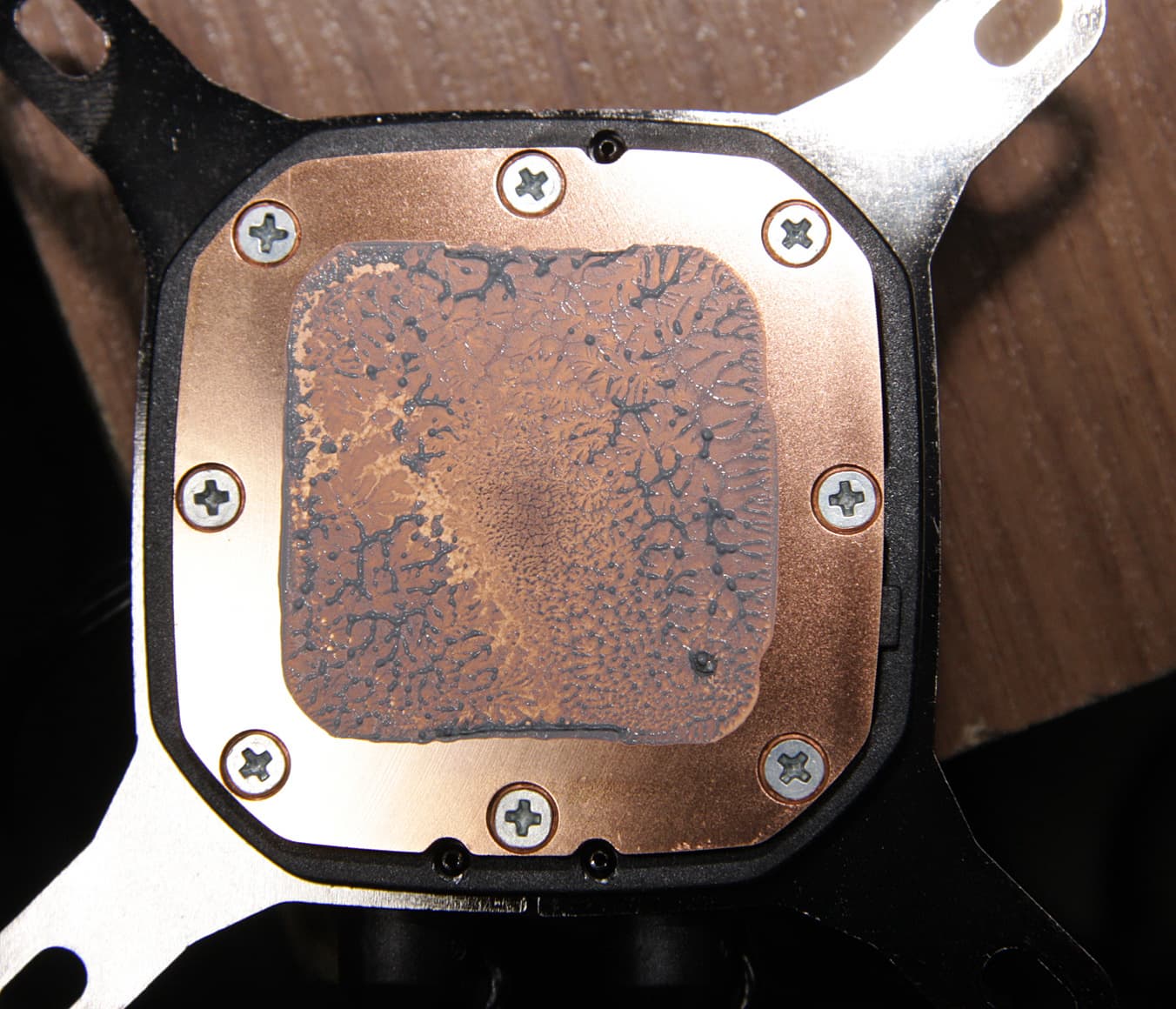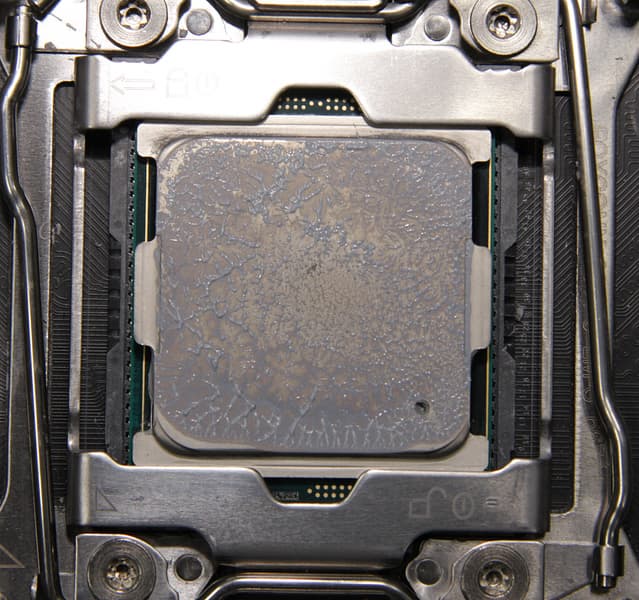 Видно, что термопаста распределилась тонким слоем практически по всей площади крышки процессора, но в центральной части слой тоньше. Вряд ли это отрицательно сказывается на работе кулера, так как считается, что важнее хорошо охлаждать именно центральную часть крышки процессора.