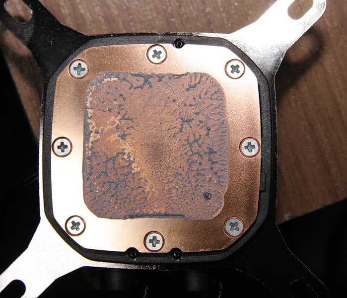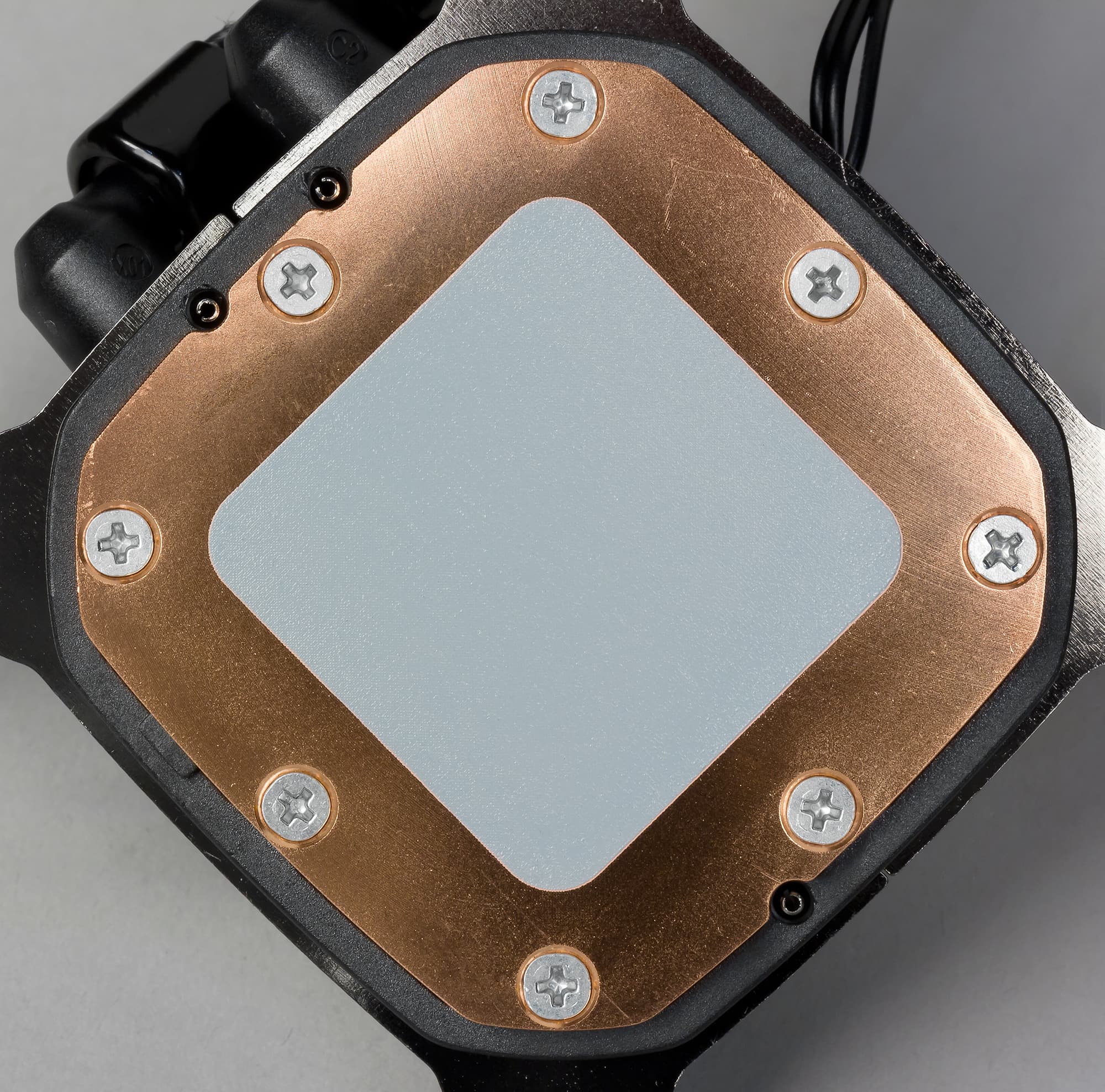 Помпа интегрирована в один блок с теплосъемником. Подошвой теплосъемника, непосредственно прилегающей к крышке процессора, служит медная пластина. Ее внешняя поверхность шлифованная и слегка полированная. Плоскость подошвы чуть-чуть выпуклая к центру.