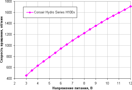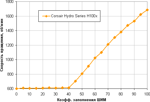 Диапазон регулировки не очень широкий, но рост скорости вращения при изменении коэффициента заполнения от 40% до 100% плавный и близок к линейному. Отметим, что при КЗ 0% вентиляторы не останавливаются, поэтому в гибридной системе охлаждения с пассивным режимом на минимальной нагрузке такие вентиляторы придется останавливать, снижая напряжение питания.