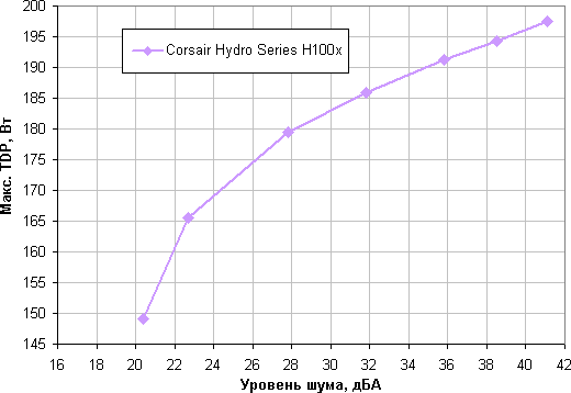 Приняв 25 дБА за критерий условной бесшумности, получим примерную максимальную мощность процессоров, соответствующих этому уровню, это порядка 170 Вт. Гипотетически, если не обращать внимания на уровень шума, пределы мощности можно увеличить еще где-то до 195 Вт. Еще раз уточним, это в жестких условиях обдува радиатора нагретым до 44 градусов воздухом, при снижении температуры воздуха указанные пределы мощности для бесшумной работы и максимальной мощности возрастают. В целом данная система является типичной по производительности в своем классе (на два вентилятора 120 мм).