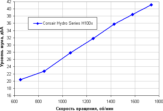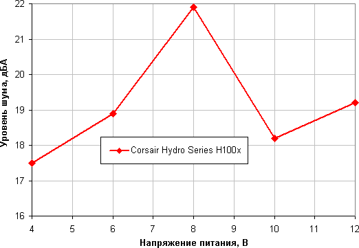 Уровень шума этой системы охлаждения меняется в широком диапазоне. Зависит, конечно, от индивидуальных особенностей и других факторов, но где-то от 40 дБА и выше шум, с нашей точки зрения, очень высокий для настольной системы; от 35 до 40 дБА уровень шума относится к разряду терпимых; ниже 35 дБА шум от системы охлаждения не будет сильно выделяться на фоне типичных небесшумных компонентов ПК — корпусных вентиляторов, вентиляторов на блоке питания и на видеокарте, а также жестких дисков; а где-то ниже 25 дБА кулер можно назвать условно бесшумным. Фоновый уровень был равен 17,2 дБА (условное значение, которое показывает шумомер). Уровень шума только от помпы равен всего 19,2 дБА. Помпа очень тихая. Приведем зависимость уровня шума только помпы от напряжения.