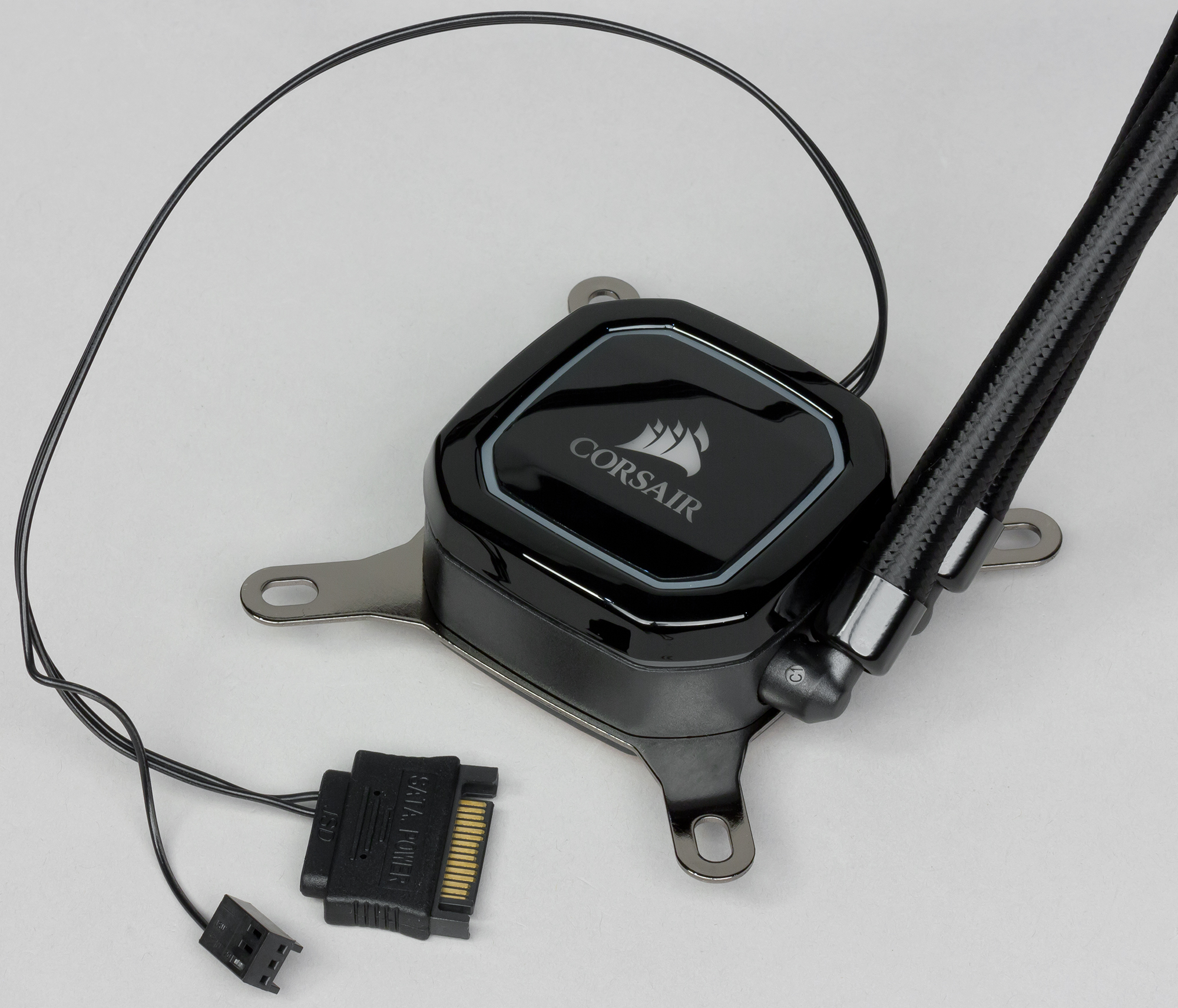 В плане корпус помпы — квадрат со скошенными и слегка закругленными углами с расстоянием между сторонами примерно 62 мм. Высота помпы всего 33 мм. Длина кабеля питания SATA от помпы 28 см, а длина кабеля в разъем вентилятора на системной плате 29 см. Шланги относительно жесткие и упругие, они заключены в оплетку из скользкого пластика, внешний диаметр шлангов с оплеткой примерно 10,5 мм. Длина шлангов — 35 см до гильз фиттингов. Г-образные фитинги на входе в помпу поворачиваются, что облегчает установку системы. Радиатор изготовлен из алюминия и снаружи имеет черное матовое относительно стойкое покрытие. Габариты радиатора — 273,5×119×27 мм.