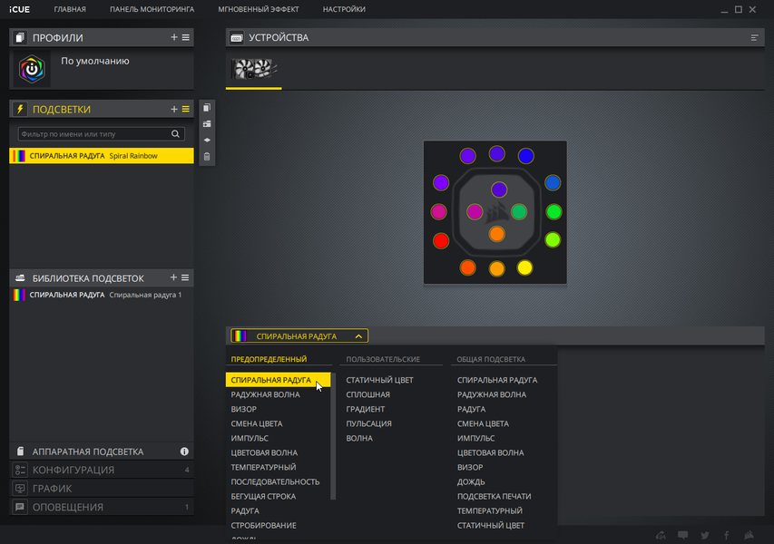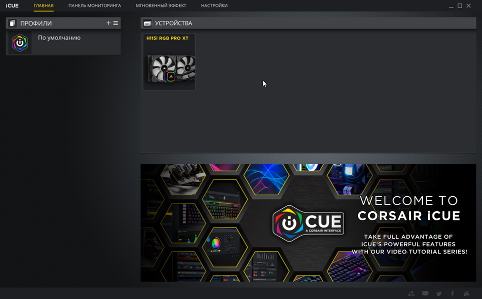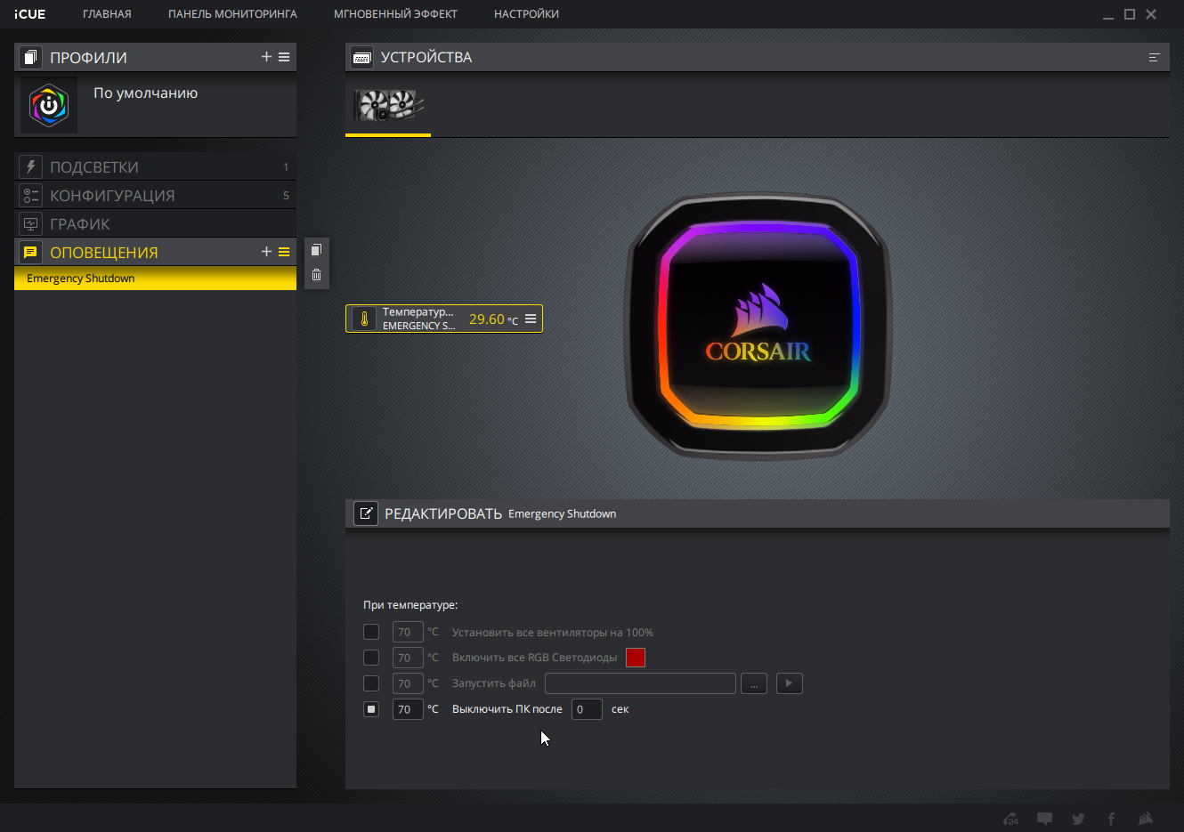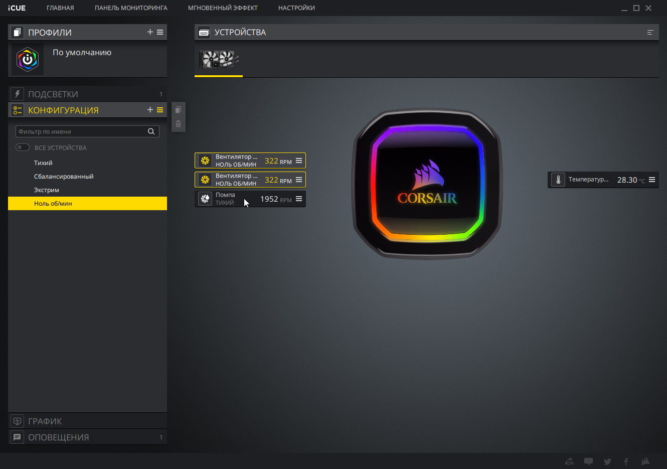 Для управления работой системы охлаждения, а именно работой вентиляторов, помпы и подсветки, на ПК нужно установить фирменное ПО iCue. Пройдемся по тем функциям, которые имеют непосредственное отношение к рассматриваемой системе охлаждения. Для доступа к ним нужно выбрать систему в главном окне.