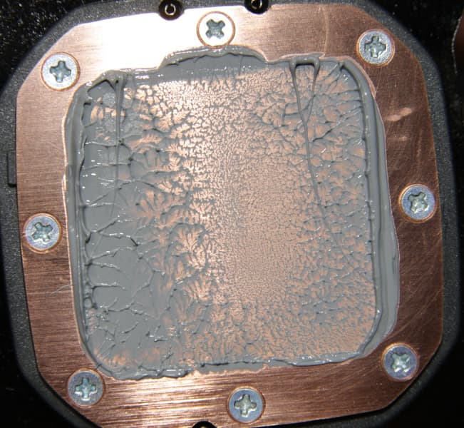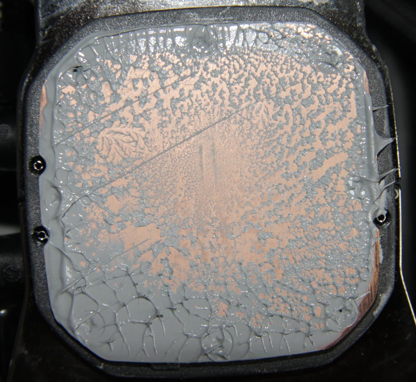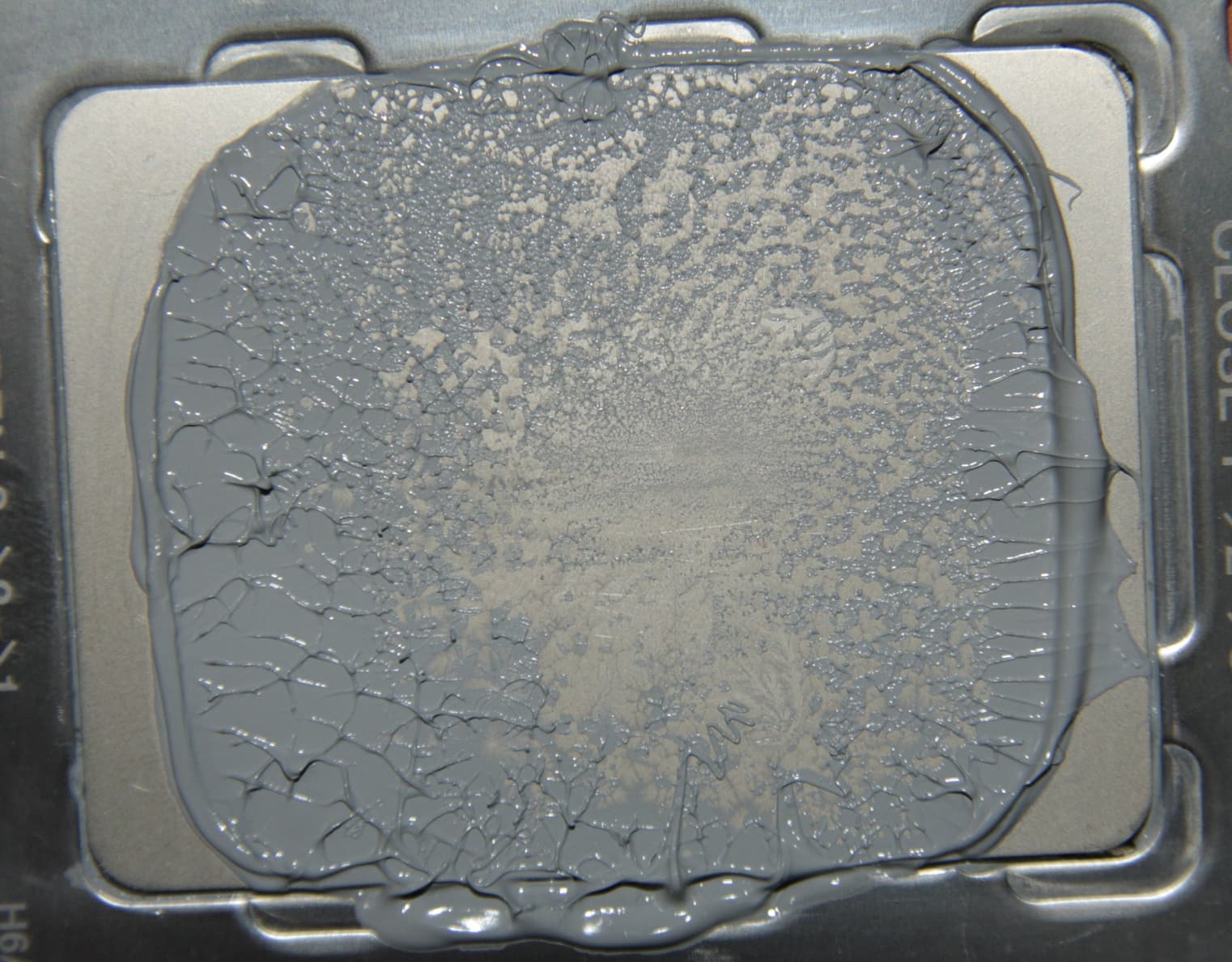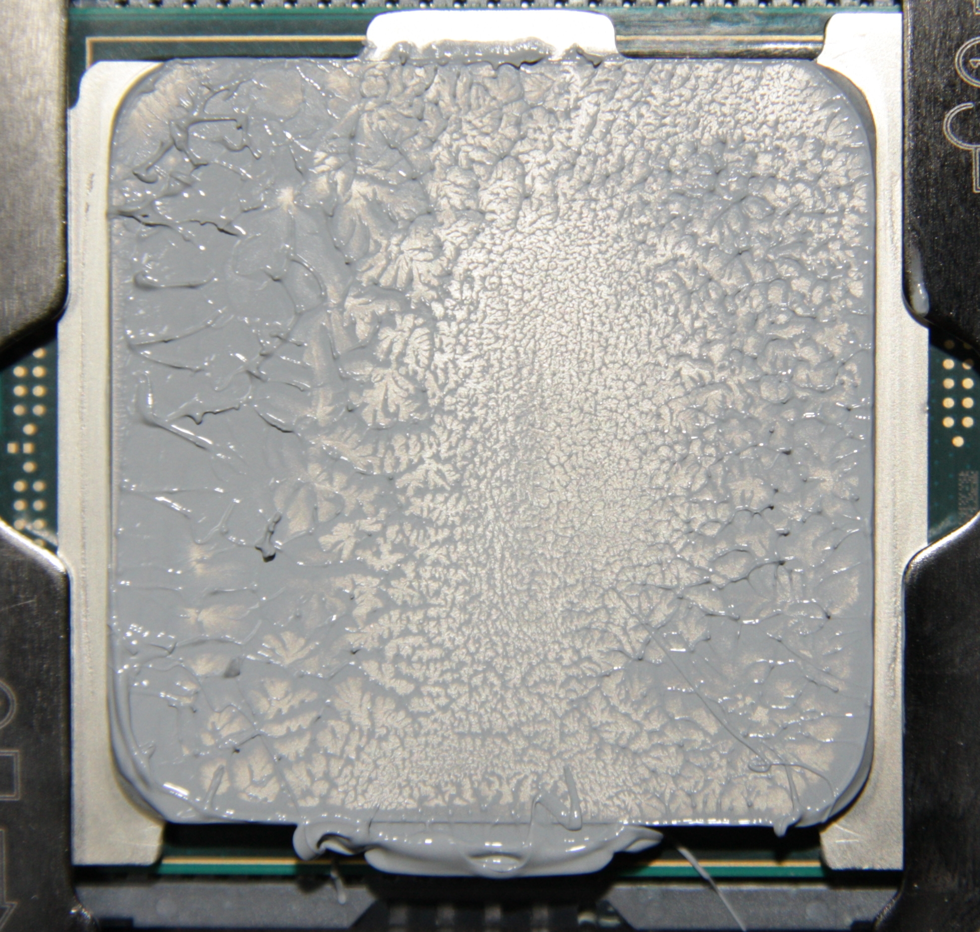 Запаса для ее восстановления в комплекте поставки, к сожалению, нет. Во всех тестах использовалась качественная термопаста другого производителя, расфасованная в шприц. Забегая вперед, продемонстрируем распределение термопасты после завершения всех тестов. На процессоре Intel Core i9-7980XE: