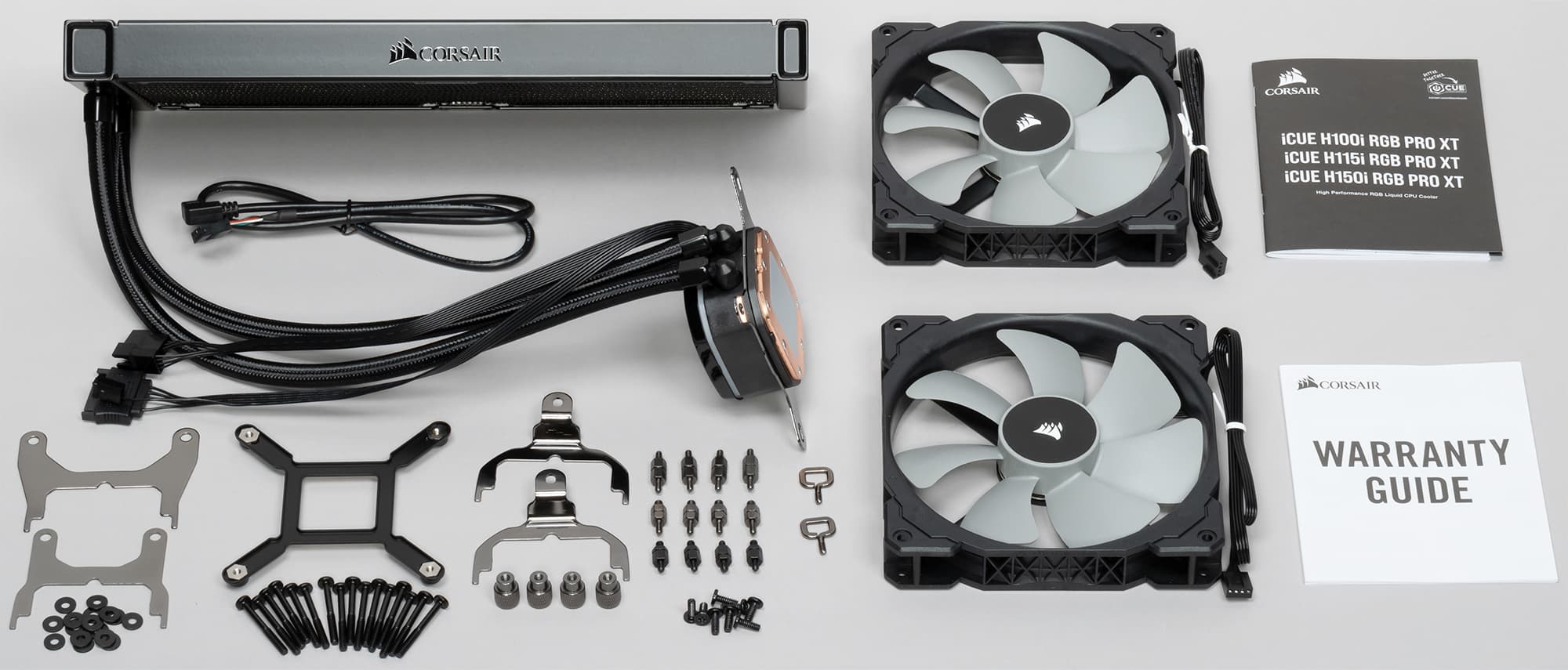 Внутри коробки находятся радиатор с подключенной помпой, вентиляторы, комплект крепежа, кабель USB, инструкция по установке и описание гарантии.