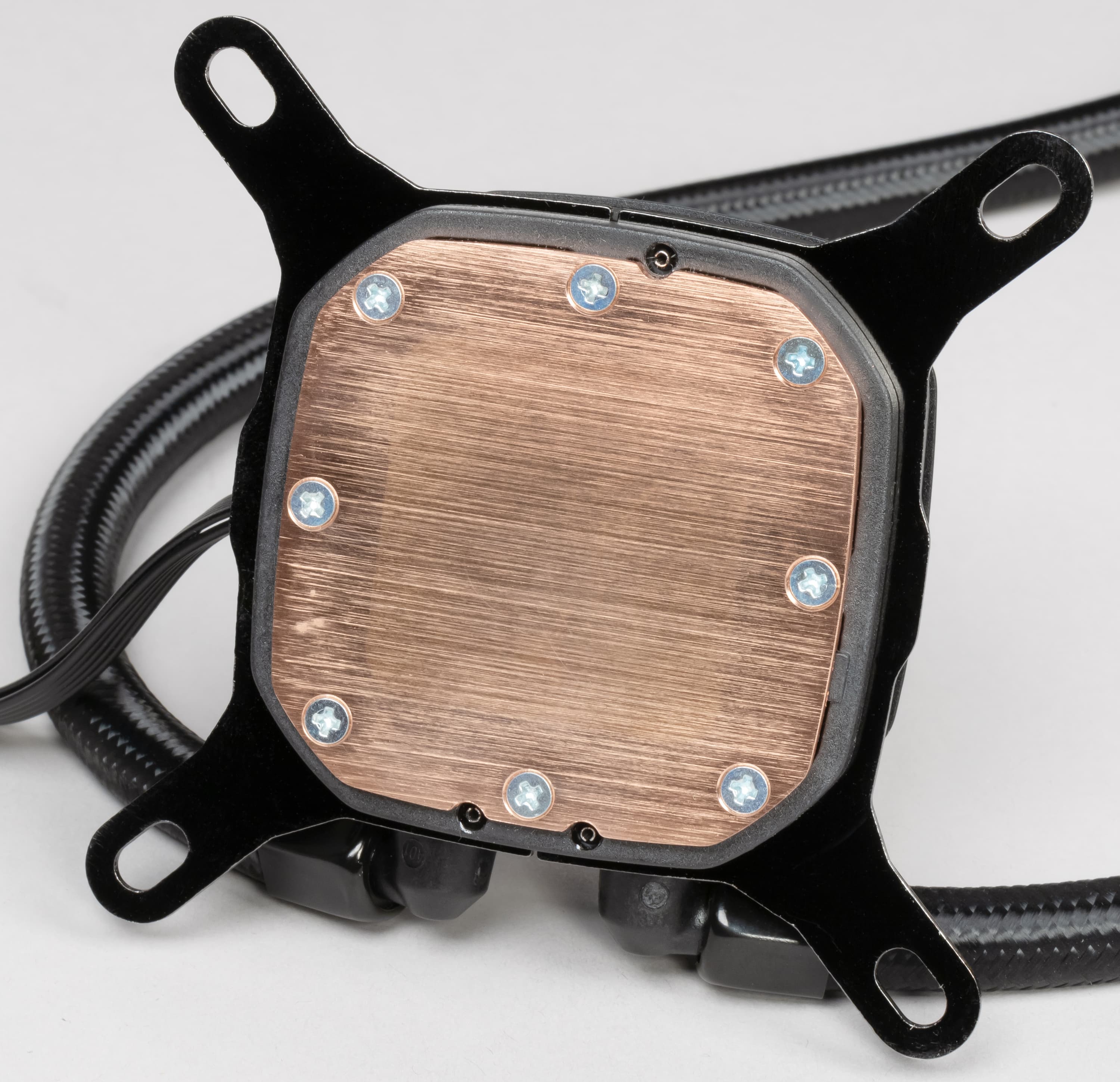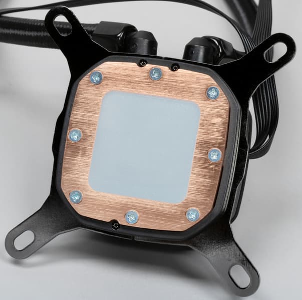 Помпа интегрирована в один блок с теплосъемником. Подошвой теплосъемника, непосредственно прилегающей к крышке процессора, служит медная пластина (толщиной по видимой части 2,5 мм). Ее внешняя поверхность шлифованная и слегка полированная. Плоскость подошвы чуть-чуть (где-то на 0,2 мм) выпуклая к центру.
