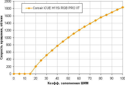 Отличный результат — очень широкий диапазон регулировки и плавный рост скорости вращения при изменении коэффициента заполнения от 15% до 100%. Отметим, что при КЗ 0% (точнее, при 15% и меньше) вентиляторы останавливаются, что может пригодиться в гибридной системе охлаждения с пассивным режимом на минимальной нагрузке. При 17% вентиляторы запускаются.