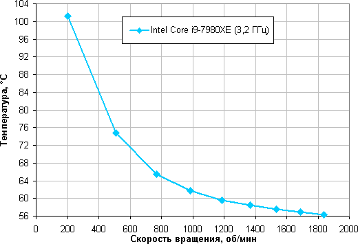 При КЗ = 20% система уже не справляется с охлаждением процессора Intel Core i9-7980XE, но это значение соответствует скорости вращения всего порядка 200 об/мин!