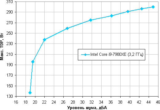 Приняв 25 дБА за критерий условной бесшумности, получим примерную максимальную мощность процессоров, соответствующих этому уровню. Это порядка 250 Вт для процессора Intel Core i9-7980XE. Если не обращать внимания на уровень шума, то пределы мощности можно увеличить где-то до 300 Вт. Еще раз уточним, это в жестких условиях обдува радиатора нагретым до 44 градусов воздухом, при снижении температуры воздуха указанные пределы мощности для бесшумной работы и максимальной мощности возрастают.