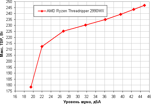 Ограничившись указанными выше условиями, построим зависимость реальной максимальной мощности (обозначенной как Макс. TDP), потребляемой процессором, от уровня шума: