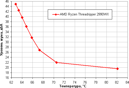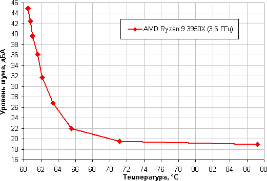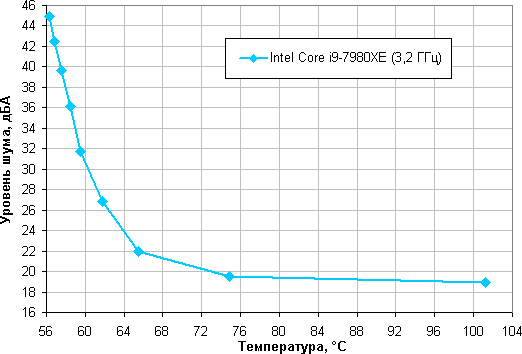 Зависимость уровня шума от температуры процессора при полной загрузке: