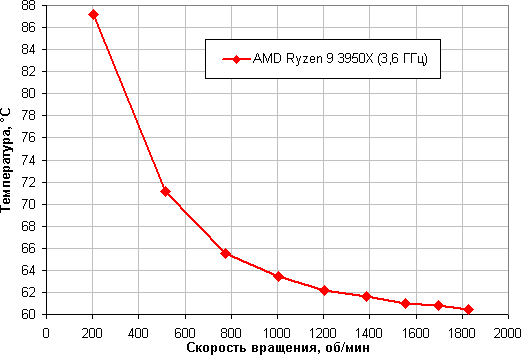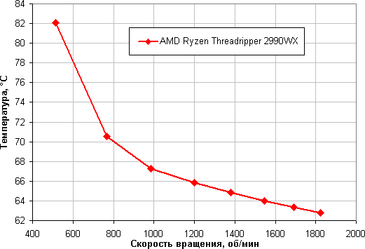 Зависимость температуры процессора AMD Ryzen Threadripper 2990WX при его полной загрузке от скорости вращения вентиляторов: