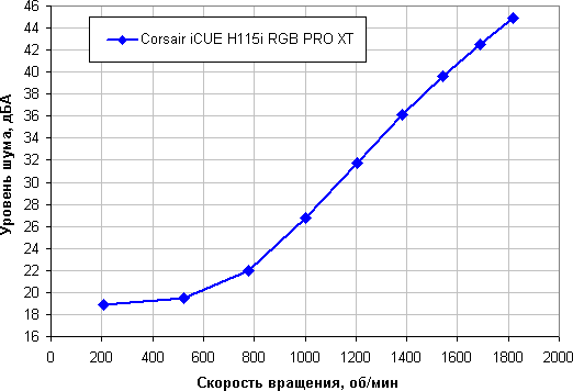 Уровень шума этой системы охлаждения меняется в широком диапазоне. Зависит, конечно, от индивидуальных особенностей и других факторов, но где-то от 40 дБА и выше шум, с нашей точки зрения, очень высокий для настольной системы; от 35 до 40 дБА уровень шума относится к разряду терпимых; ниже 35 дБА шум от системы охлаждения не будет сильно выделяться на фоне типичных небесшумных компонентов ПК — корпусных вентиляторов, вентиляторов на блоке питания и на видеокарте, а также жестких дисков; а где-то ниже 25 дБА кулер можно назвать условно бесшумным. В данном случае охватывается весь указанный диапазон, то есть в зависимости от скорости вращения вентиляторов система может быть как шумной, так и очень тихой. Фоновый уровень был равен 16,0 дБА (условное значение, которое показывает шумомер). Уровень шума только от помпы, работающей на максимальных оборотах, равен всего 18,7 дБА. Помпа очень тихая. Отметим, что при значительном снижении скорости вращения помпы с помощью ПО iCue уровень шума от помпы возрастает.