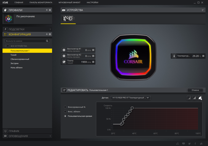 Пользователь может создать собственный профиль с зависимостью скорости вращения от показания одного из доступных в системе датчиков температуры.