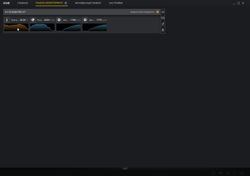 Можно отслеживать значения температуры охлаждающей жидкости, скорости вращения всех двух вентиляторов и помпы, в том числе и в виде графиков за определенный период времени.