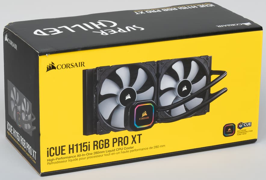 Поставляется система жидкостного охлаждения Corsair iCue H115i RGB Pro XT в коробке из среднего по толщине гофрированного картона. Оформление коробки красочное, с использованием фирменных желтого и черного цветов. На внешних плоскостях коробки не только в цвете изображен сам продукт, но и перечислены основные особенности, технические характеристики, указана комплектация и есть чертеж радиатора с главными размерами. Надписи выполнены на нескольких языках, включая русский. Для защиты и распределения деталей используются форма из папье-маше, прокладка из вспененного полиэтилена, чехлы из вспененного полиэтилена и пластиковые пакеты. Подошва теплосъемника и термопаста на ней защищены колпаком из прозрачного пластика.