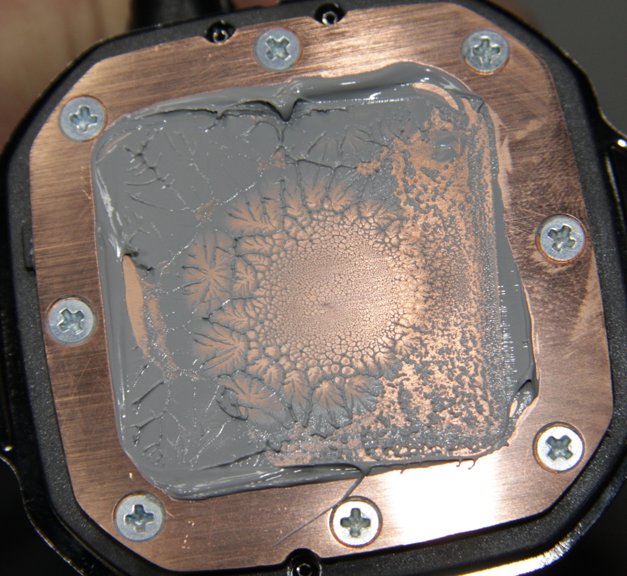 В данном случае также в центре есть большое пятно плотного контакта. (Распределение термопасты, конечно, немного изменилось при разъединении процессора и помпы.)
