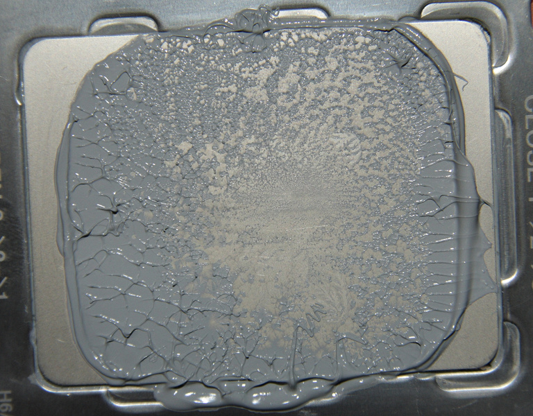 Видно, что термопаста распределилась практически по всей площади крышки процессора, а примерно по центру есть большой участок плотного контакта. Отметим, что крышка этого процессора сама по себе чуть выпуклая к центру.