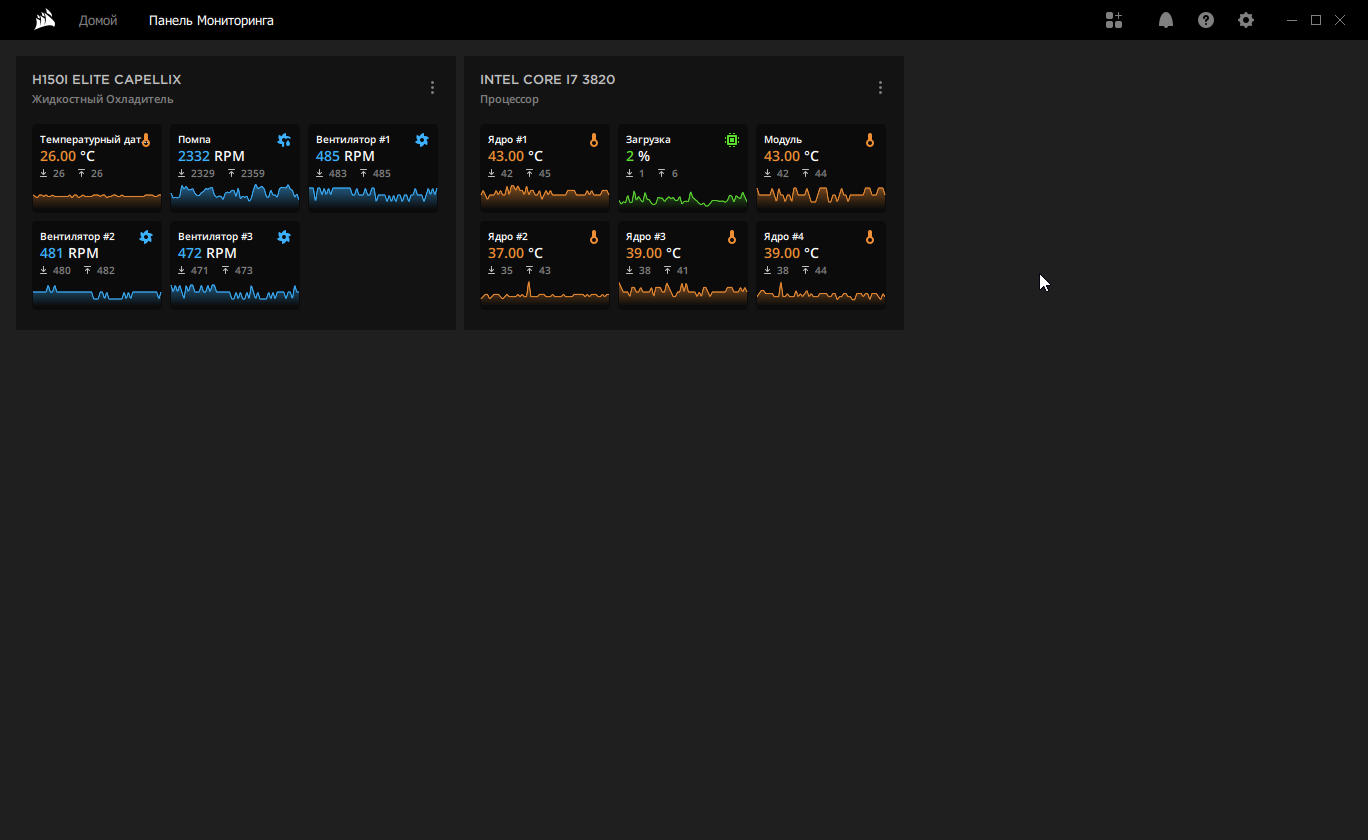 Можно отслеживать значения температуры охлаждающей жидкости, скорости вращения всех вентиляторов, подключенных к контроллеру, и помпы, а также других доступных в системе датчиков в том числе и в виде графиков за определенный период времени.