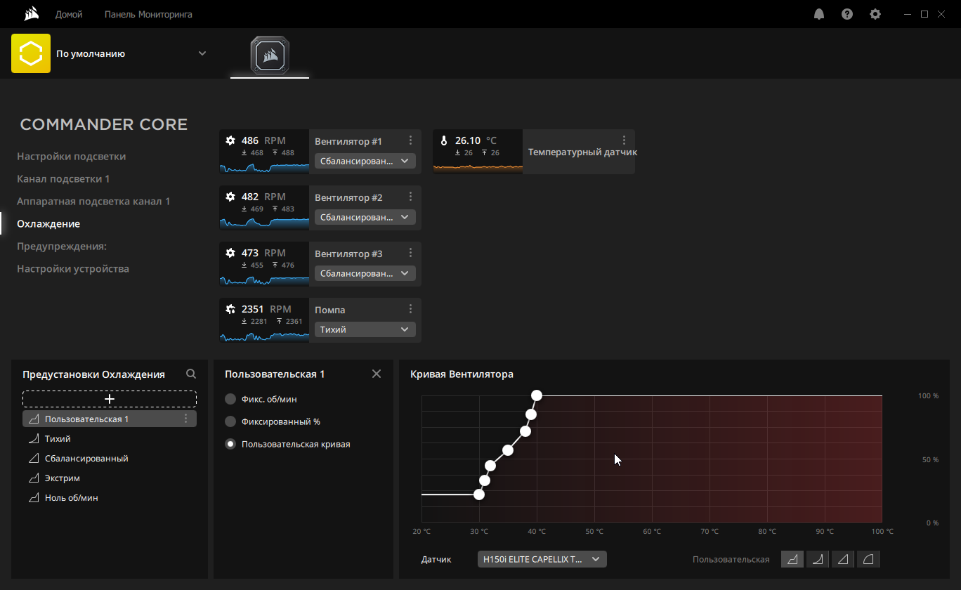 Для вентиляторов и помпы можно выбрать один из предустановленных профилей с различными видами зависимости скорости вращения от температуры, при этом в случае вентиляторов доступен профиль с остановкой при низкой температуре. Дополнительно пользователь может создать собственный профиль с зависимостью скорости вращения вентилятора от показания одного из доступных в системе датчиков температуры.