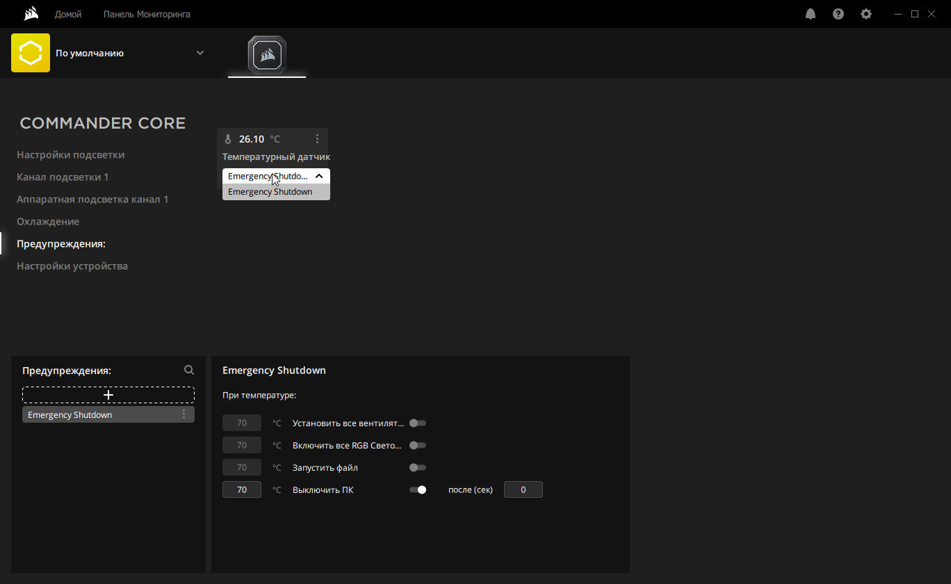 Также можно выбрать действия, которые будут выполняться при достижении пороговых значений датчика температуры.