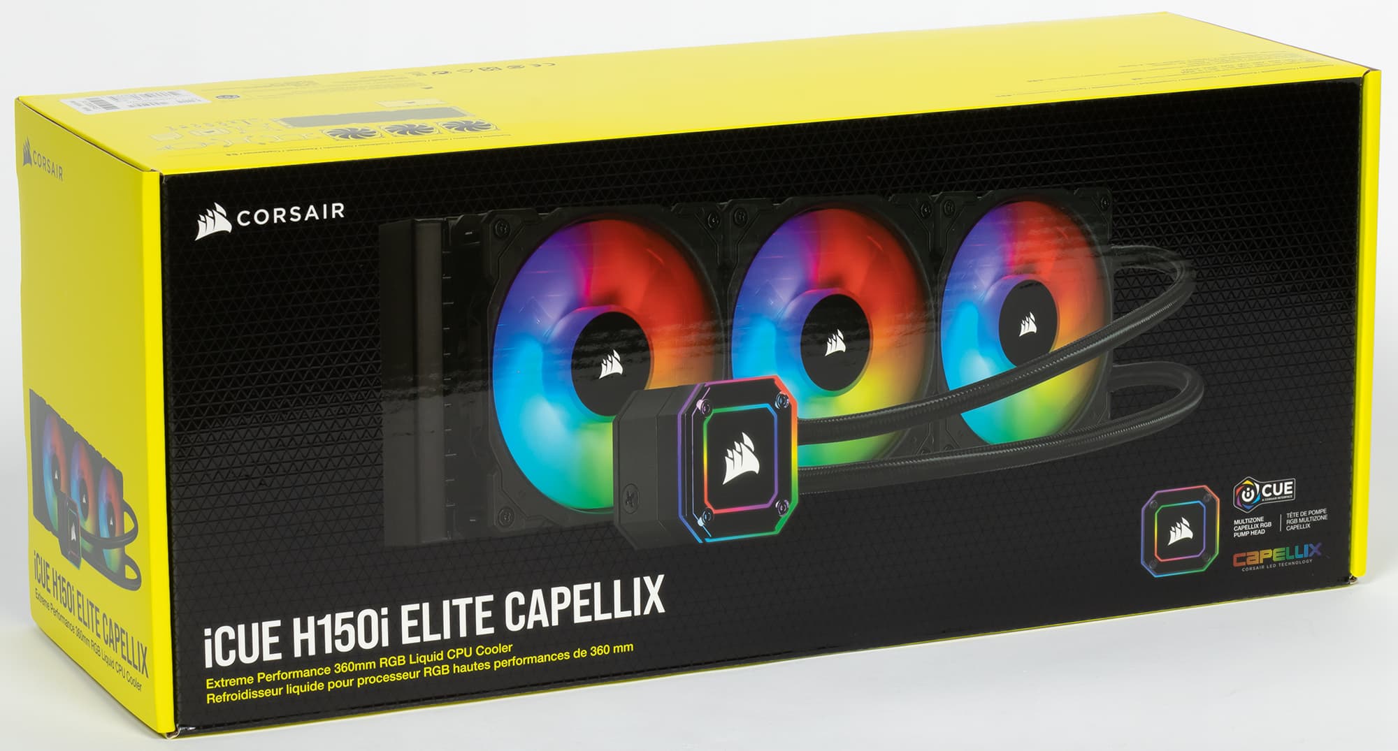 Поставляется система жидкостного охлаждения Corsair iCUE H150i Elite Capellix в коробке из среднего по толщине гофрированного картона. Оформление коробки красочное, с использованием фирменных желтого и черного цветов, часть изображений покрыта лаком. На внешних плоскостях коробки не только в цвете изображен сам продукт, но и перечислены основные особенности, технические характеристики, указана комплектация (в картинках) и есть чертеж радиатора с главными размерами. Надписи выполнены на нескольких языках, включая русский. Для защиты и распределения деталей используются форма из папье-маше, прокладка из вспененного полиэтилена, чехлы из вспененного полиэтилена и пластиковые пакеты. Подошва теплосъемника и термопаста на ней защищены колпаком из прозрачного пластика.
