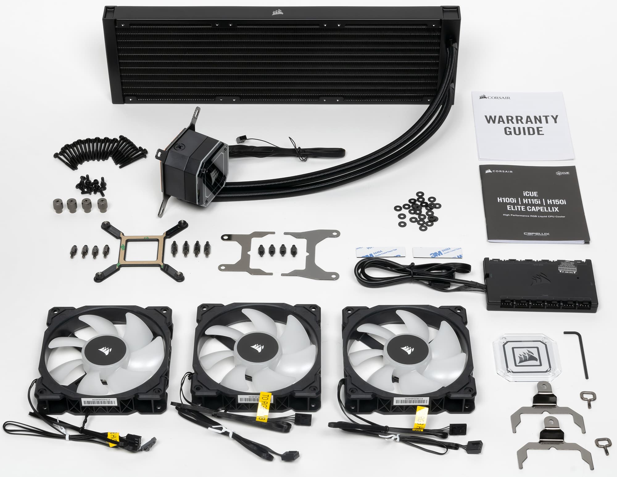 Внутри коробки находятся радиатор с подключенной помпой, вентиляторы, комплект крепежа, контроллер, инструкция по установке, описание гарантии и т. д.