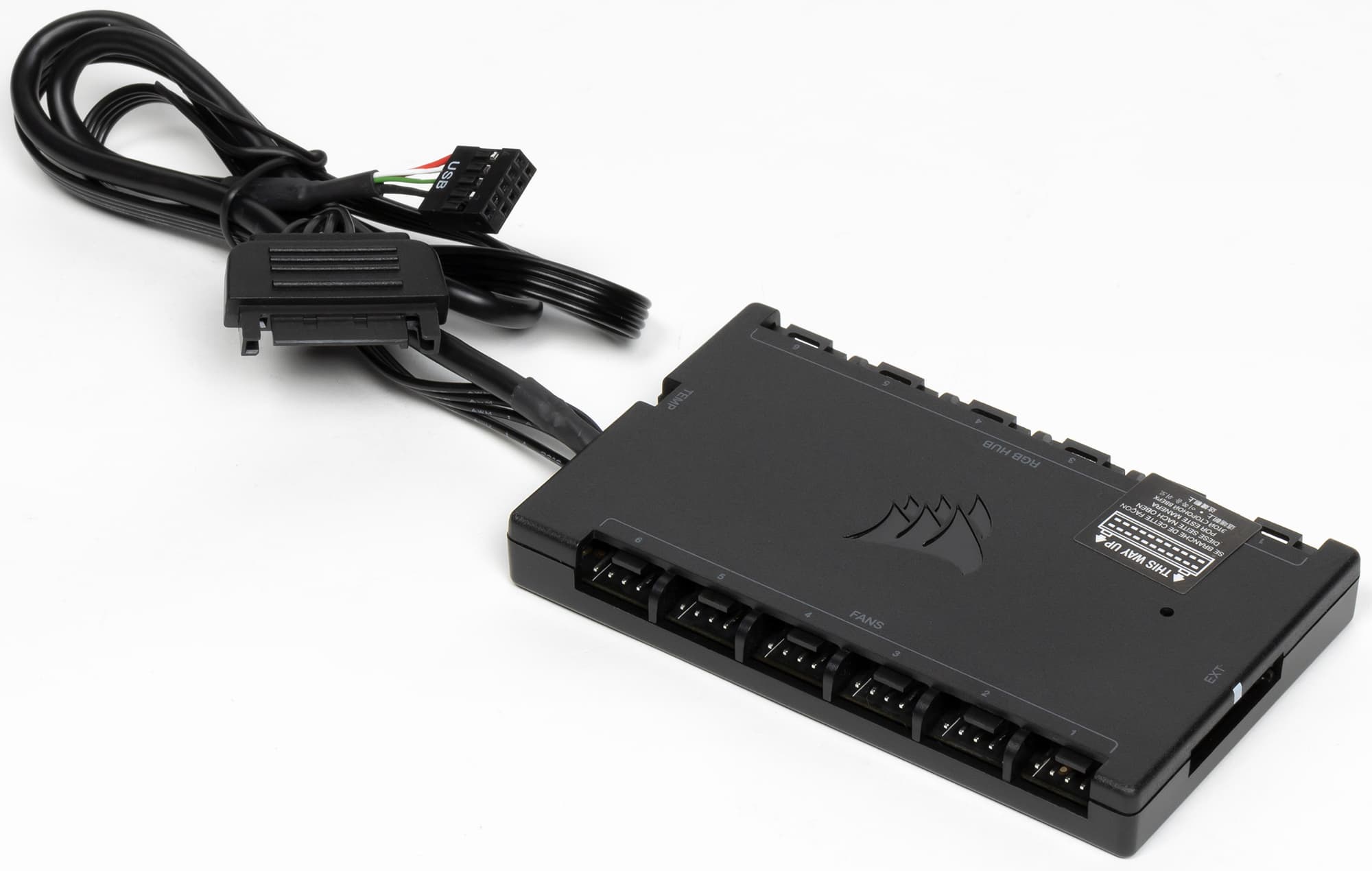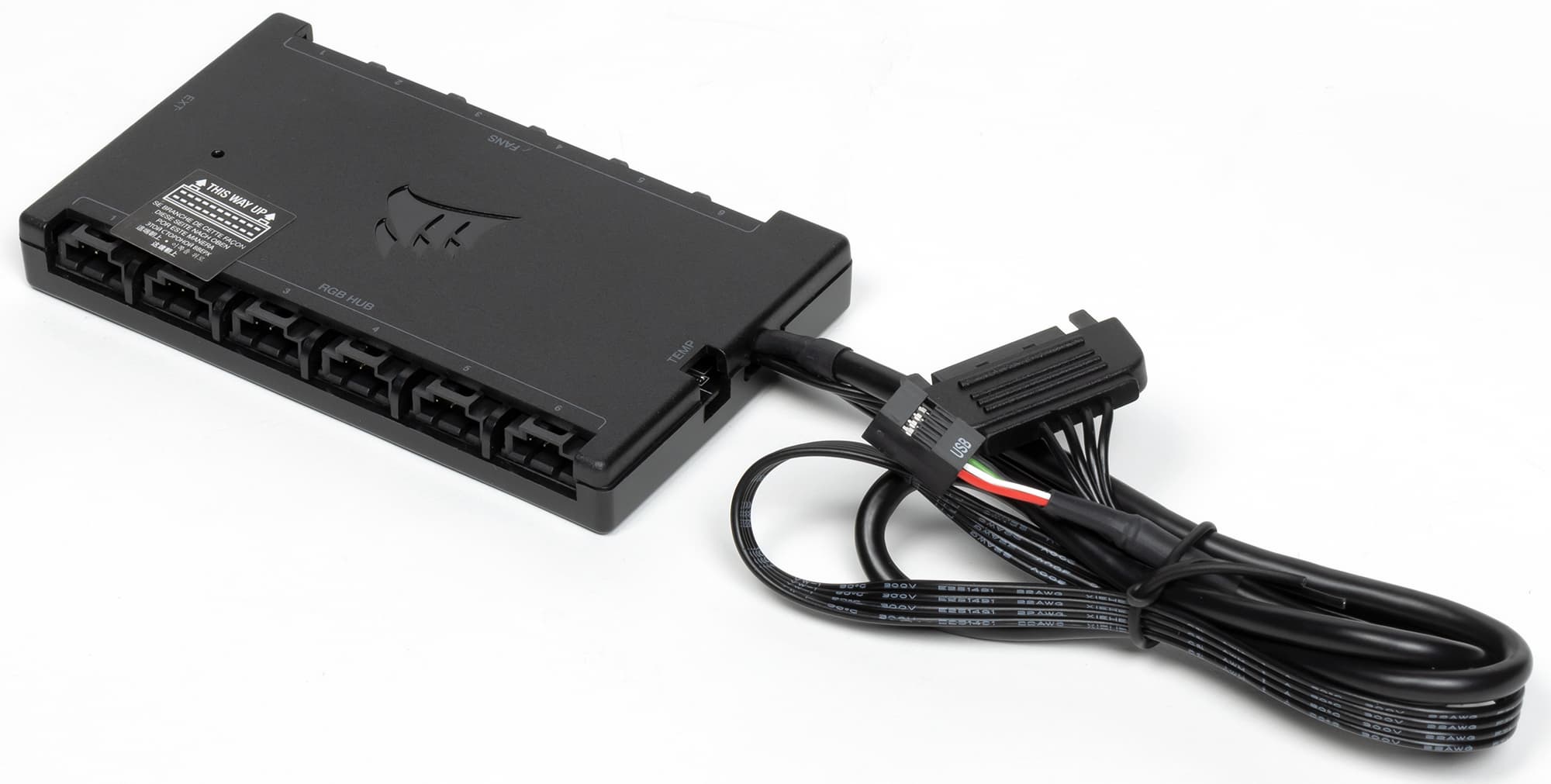 Нижняя плоскость контроллера ровная, что позволяет закрепить его внутри корпуса с помощью площадок с двусторонним клейким слоем, входящими в комплект поставки. Помпа к контроллеру подключается специальным многожильным кабелем. Как видно, разъемов для вентиляторов на контроллере всего шесть пар (один разъем для мотора, второй — для подсветки), то есть к нему можно подключить еще три вентилятора, которые можно купить по отдельности и без контроллера. От контроллера отходит неотсоединяемый кабель питания с разъемом SATA (46 см). Вторым неотсоединяемым кабелем контроллер подключается к USB-колодке на системной плате (44 см). Есть и еще один разъем, предназначенный, видимо, для подключения выносного датчика температуры.