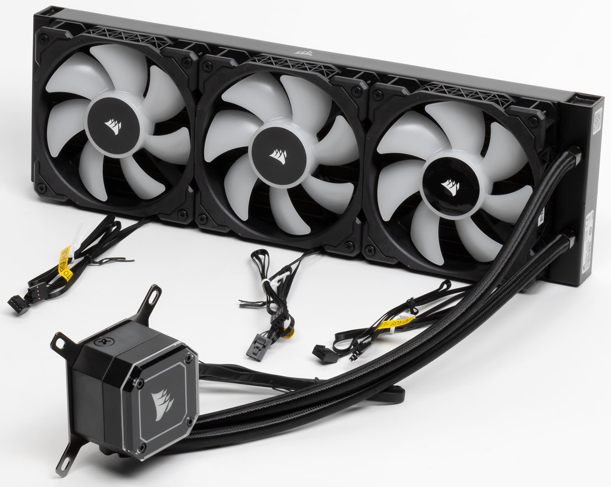 Декоративной оплетки на кабелях от вентиляторов нет, как нет ее и на кабелях от помпы (термоусадочная трубка не считается), что облегчает установку. От каждого вентилятора отходит два кабеля, оба с четырехконтактными разъемами, но разного типа. Первым кабелем мотор вентилятора подключается к контроллеру из комплекта (но можно и к стандартным 3(4)-штырьковым разъемам на материнской плате, вот только зачем?). Вторым кабелем подключается подсветка вентилятора все к тому же контроллеру, только к другим разъемам. Длина кабелей питания и подсветки вентилятора — по 60 см.
