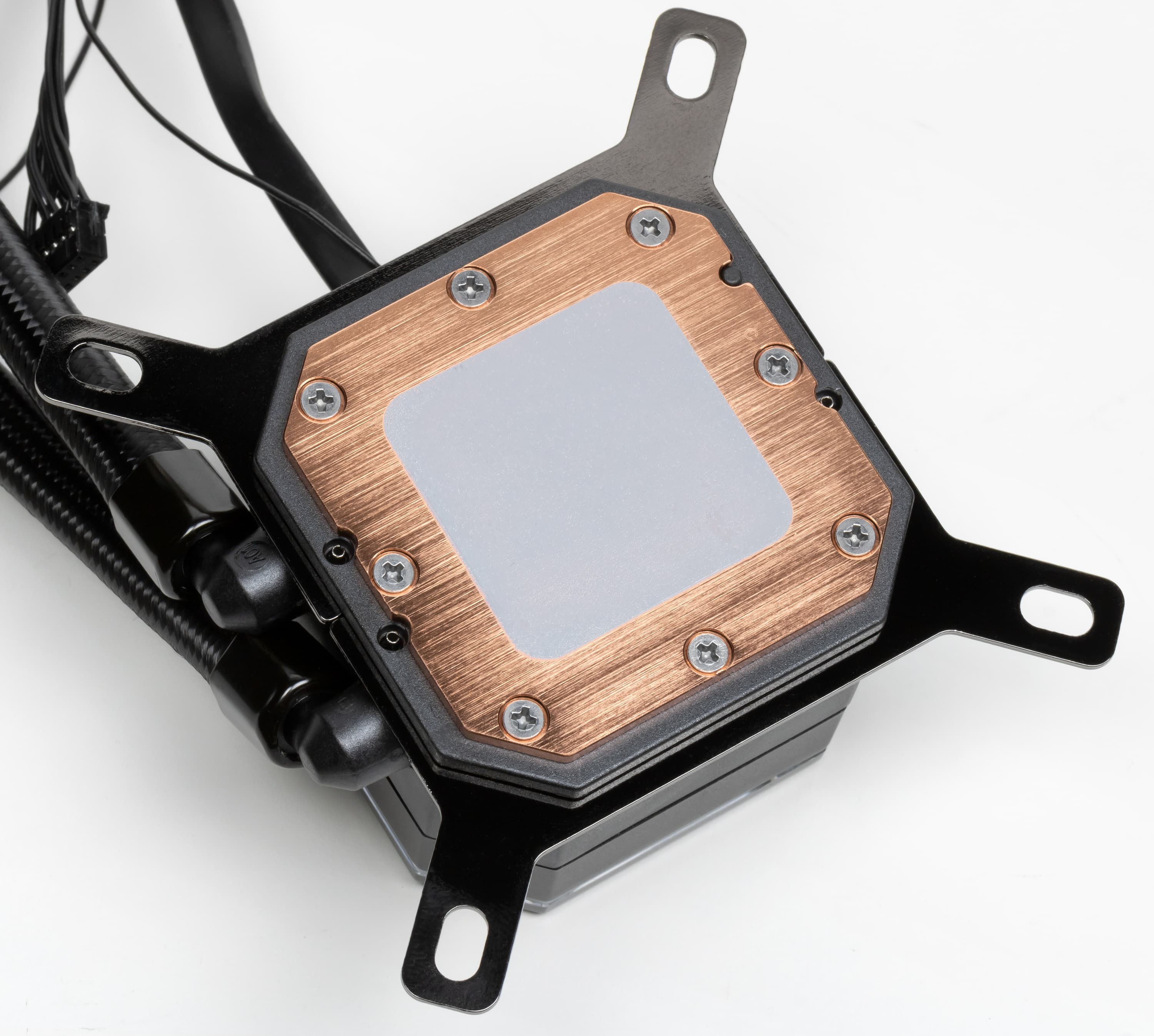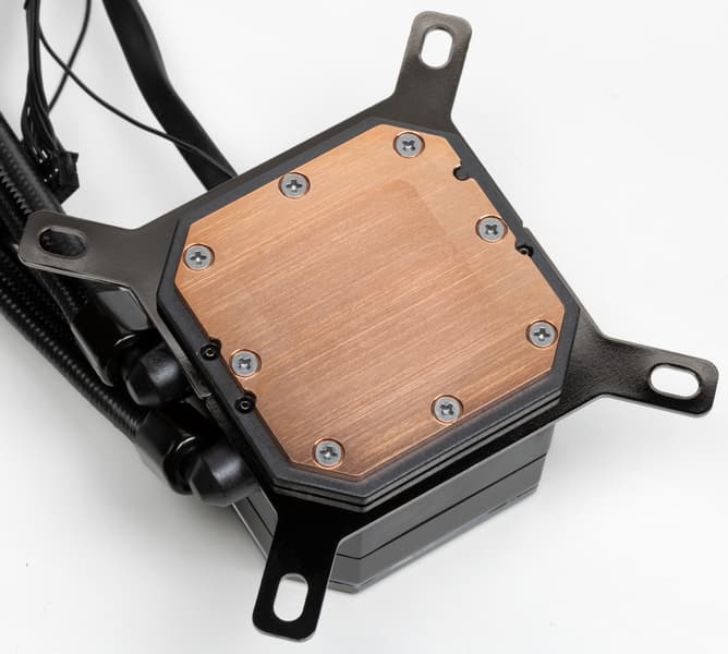 Помпа интегрирована в один блок с теплосъемником. Подошвой теплосъемника, непосредственно прилегающей к крышке процессора, служит медная пластина (толщиной по видимой части 2,5 мм). Ее внешняя поверхность шлифованная и слегка полированная. Плоскость подошвы чуть-чуть (где-то на 0,2 мм) выпуклая к центру.