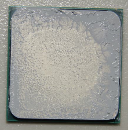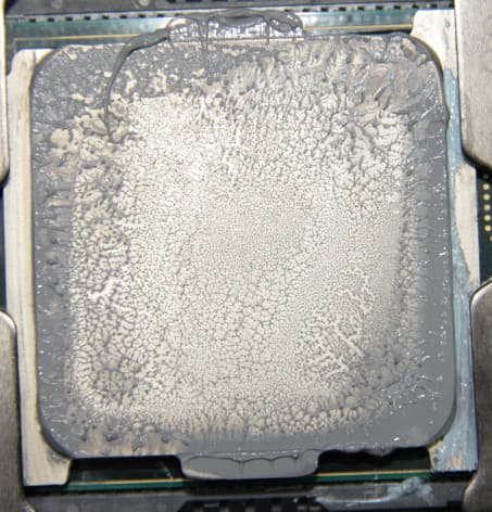 Видно, что термопаста распределилась практически по всей площади крышки процессора, а примерно по центру есть большой участок плотного контакта. Отметим, что крышка этого процессора сама по себе чуть выпуклая к центру.