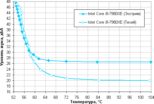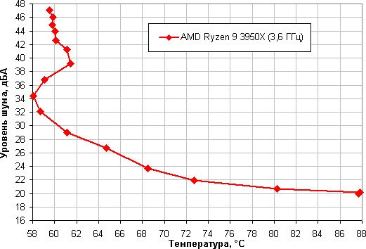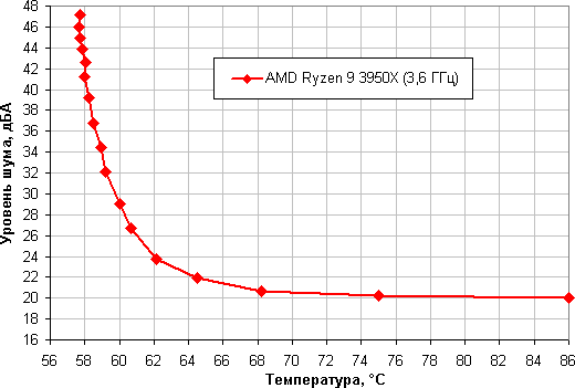 Зависимость уровня шума от температуры процессора при полной загрузке:
