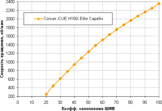 Отличный результат — очень широкий диапазон регулировки и плавный рост скорости вращения при изменении коэффициента заполнения от 20% до 100%. Отметим, что при КЗ 0% (точнее, при 15%-16% и меньше) вентиляторы останавливаются, что может пригодиться в гибридной системе охлаждения с пассивным режимом на минимальной нагрузке. При 16%-17% вентиляторы запускаются.