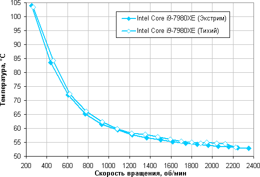 Зависимость температуры процессора при его полной загрузке от скорости вращения вентиляторов: