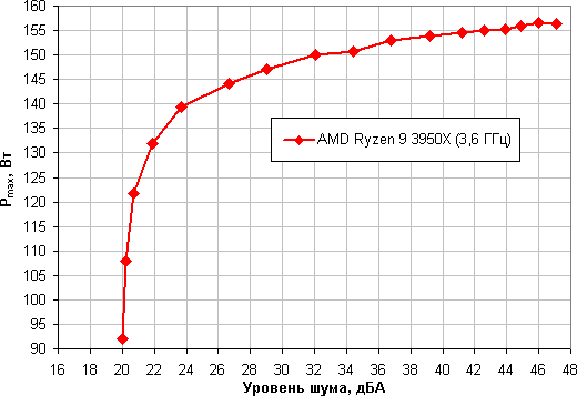 Приняв 25 дБА за критерий условной бесшумности, получим, что максимальная мощность процессора, соответствующая этому уровню, составляет порядка 140 Вт. Если не обращать внимания на уровень шума, то предел мощности можно увеличить где-то до 155 Вт. Еще раз уточним: это в жестких условиях обдува радиатора нагретым до 44 градусов воздухом. При снижении температуры воздуха указанные пределы мощности для бесшумной работы и максимальной мощности возрастают. Результат заметно хуже, чем в случае процессора Intel Core i9-7980XE. Впрочем, при условии достаточно хорошей вентиляции в корпусе данный кулер вполне справится с охлаждением процессора AMD Ryzen 9 3950X, но на возможность существенного разгона рассчитывать уже не стоит.