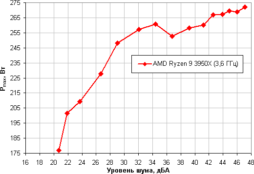 Ограничившись указанными выше условиями, построим зависимость реальной максимальной мощности (обозначенной как Pmax), потребляемой процессором, от уровня шума уже в случае AMD Ryzen Threadripper 2990WX: