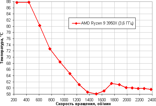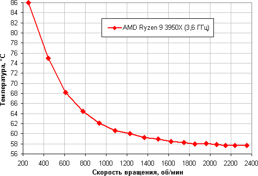 Зависимость температуры процессора AMD Ryzen Threadripper 2990WX при его полной загрузке от скорости вращения вентиляторов: