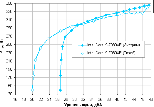Приняв 25 дБА за критерий условной бесшумности (в расчет берем режим Тихий), получим примерную максимальную мощность процессоров, соответствующих этому уровню. Это порядка 270 Вт для процессора Intel Core i9-7980XE. Если не обращать внимания на уровень шума, то пределы мощности можно увеличить где-то до 340 Вт. Еще раз уточним, это в жестких условиях обдува радиатора нагретым до 44 градусов воздухом, при снижении температуры воздуха указанные пределы мощности для бесшумной работы и максимальной мощности возрастают.