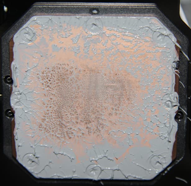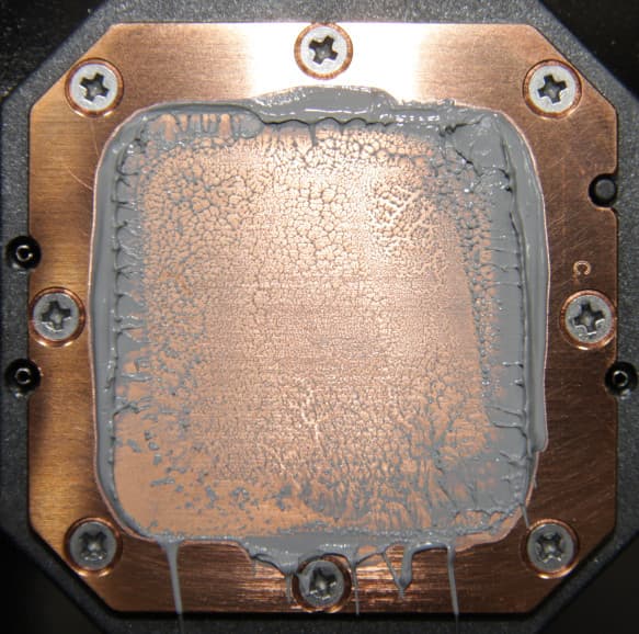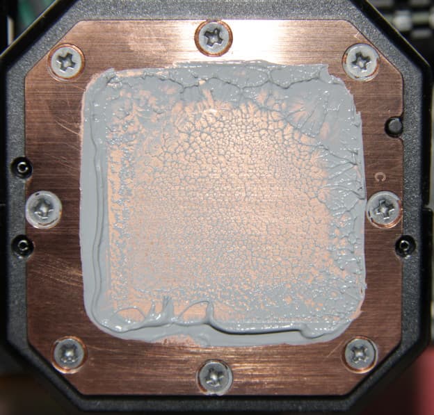 Запаса для ее восстановления в комплекте поставки, к сожалению, нет. Во всех тестах использовалась качественная термопаста другого производителя, расфасованная в шприц. Забегая вперед, продемонстрируем распределение термопасты после завершения всех тестов. На процессоре Intel Core i9-7980XE: