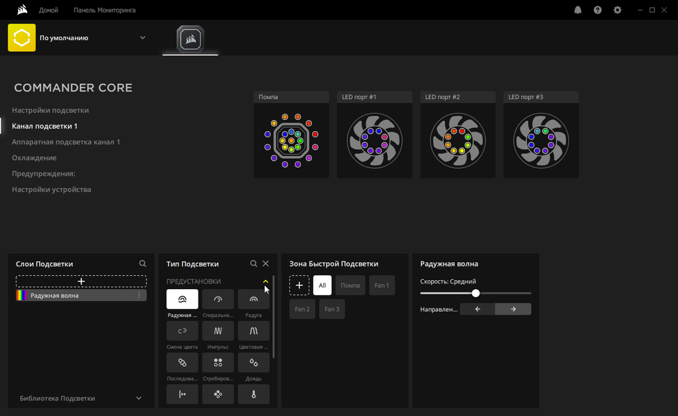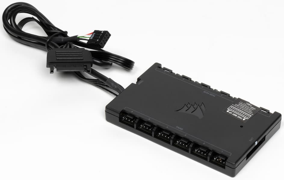 Для управления подсветкой, помпой и вентиляторами, а также для контроля за работой вентиляторов и помпы используется контроллер iCUE Commander Core.
