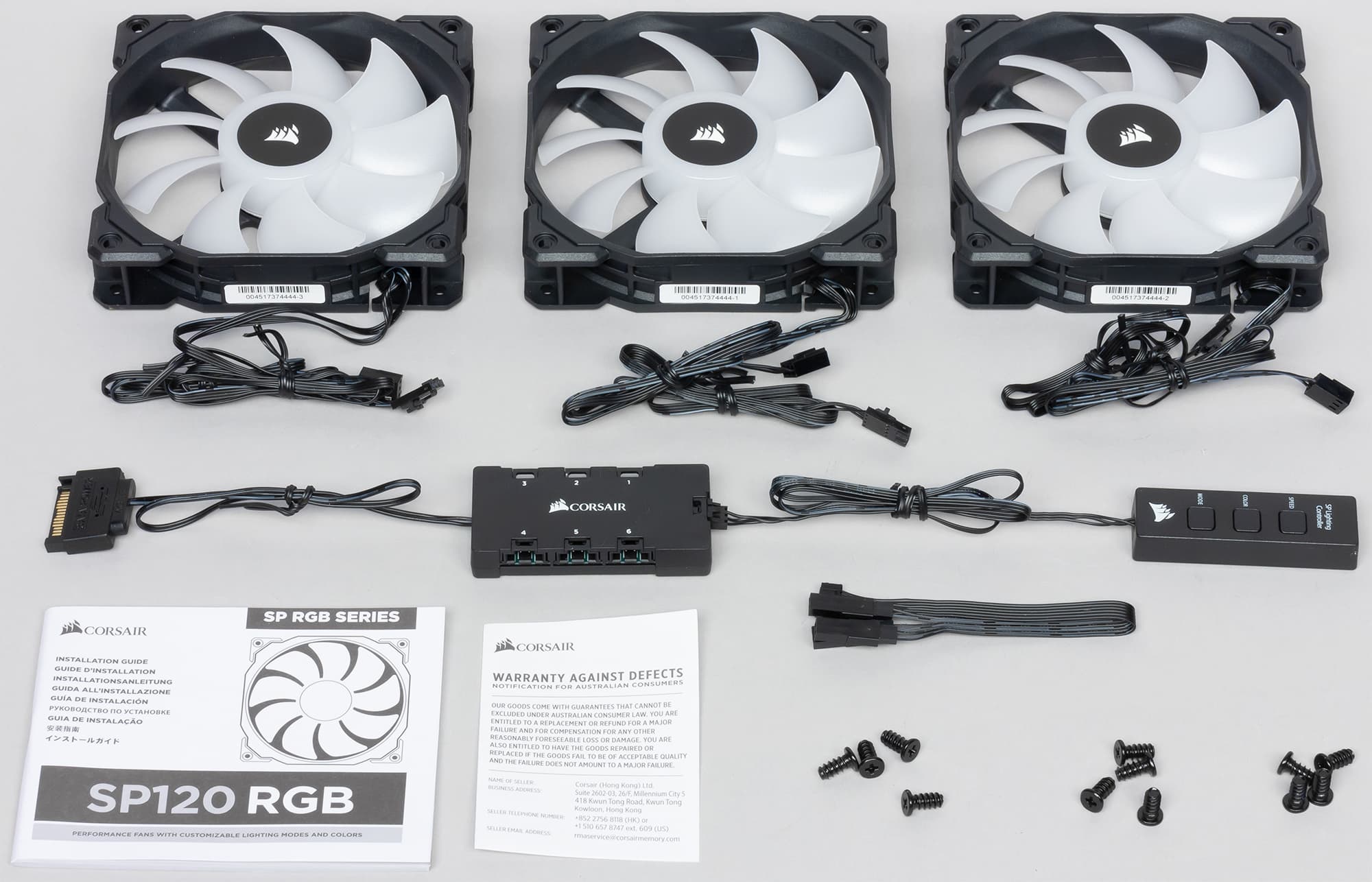 В комплект набора входят три описанных вентилятора, а также по четыре самонарезных винта к каждому вентилятору, контроллер, блок с тремя кнопками и кабель для подключения внешних кнопок управления. Руководство представляет собой миниатюрную брошюру, в которой есть вариант с текстом на русском языке.
