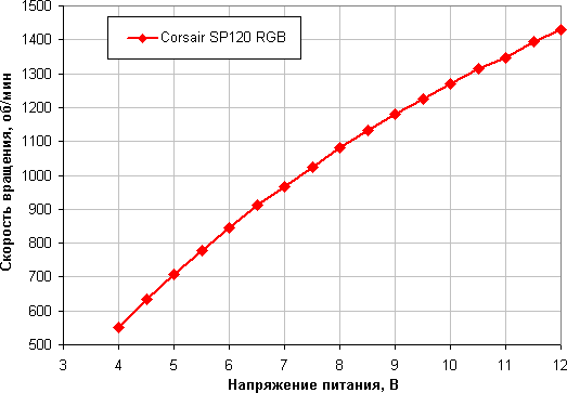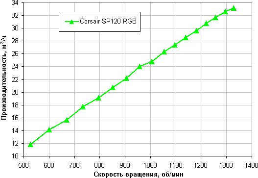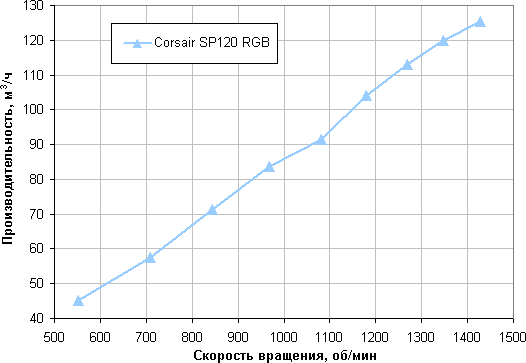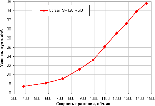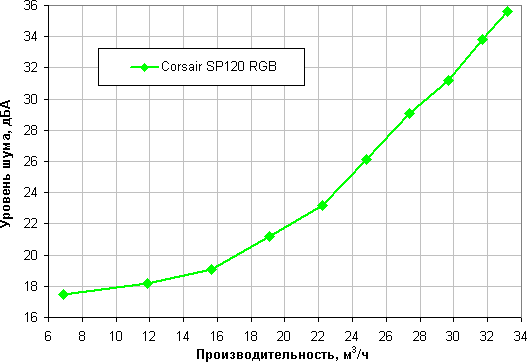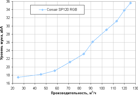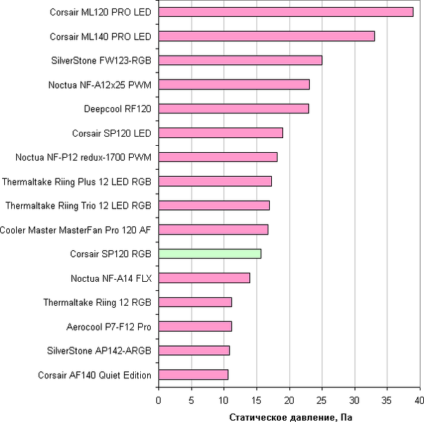 Отметим, что большая величина статического давления позволит сохранить поток воздуха на приемлемом уровне в случае большой аэродинамической нагрузки, создаваемой, например, плотными противопылевыми фильтрами в корпусе. Corsair SP120 RGB LED по данному параметру занимает среднюю позицию. Напомним, что этот параметр приводится для максимальной скорости вращения, на которой и шум максимальный. То есть диаграмма выше позволяет выбрать лучший вентилятор, если нужно прокачать воздух через что-то плотное, невзирая на уровень шума.