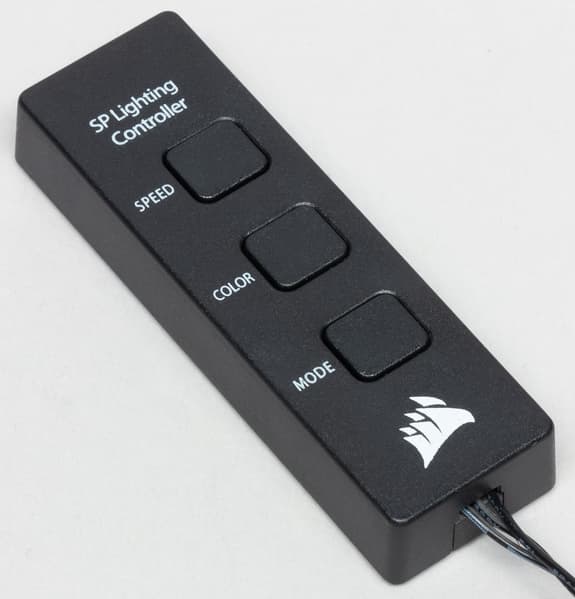 Кнопки на блоке переключают скорость изменения динамических эффектов (Speed), цвет (Color) и режим работы (Mode). Еще один кабель, подсоединяемый к блоку с кнопками, позволяет подключать внешние кнопки для управления подсветкой. Примерами таких кнопок являются кнопки сброса и питания на корпусе.