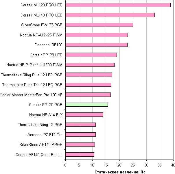 В этом случае данный вентилятор занял второе место. Получается, что вопреки ожиданиям производителя вентилятор Corsair SP120 RGB LED хорошо работает при низком статическом давлении.