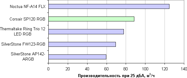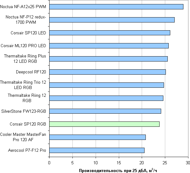 В современных условиях и в потребительском сегменте эргономика, как правило, имеет приоритет над производительностью, поэтому зафиксируем уровень шума на значении 25 дБА. Теперь для оценки вентиляторов достаточно сравнивать их производительность при данном уровне шума.