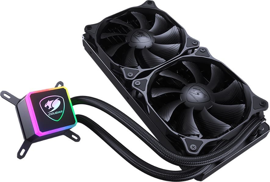 На основе системы жидкостного охлаждения Cougar Aqua 240 можно создать условно бесшумный компьютер (уровень шума 25 дБА и ниже), оснащенный процессором типа Intel Core i9-7980XE (Intel LGA2066, Skylake-X (HCC)), если потребление процессора под максимальной нагрузкой не будет превышать 220 Вт, а температура внутри корпуса не повысится выше 44 °C. При снижении температуры охлаждающего воздуха и/или менее жестких требованиях к уровню шума пределы мощности можно существенно увеличить. Любители моддинга оценят многоцветную и многозонную подсветку помпы, которой можно управлять с помощью РЧ-пульта ДУ или с помощью внешнего контроллера/системной платы, используя стандартное трехконтактное подключение для адресуемой подсветки. Отметим хорошее качество изготовления, оплетку шлангов (как минимум помогающую сохранить единый стиль оформления внутренностей компьютера), довольно длинные шланги, подключение помпы к разъему питания SATA, прочную рамку на обратную сторону системной платы. К недостаткам отнесем отсутствие возможности отслеживать скорость вращения помпы и цепляющиеся за рамку пружины на гайках. Второе можно исправить, подложив под пружины шайбы.