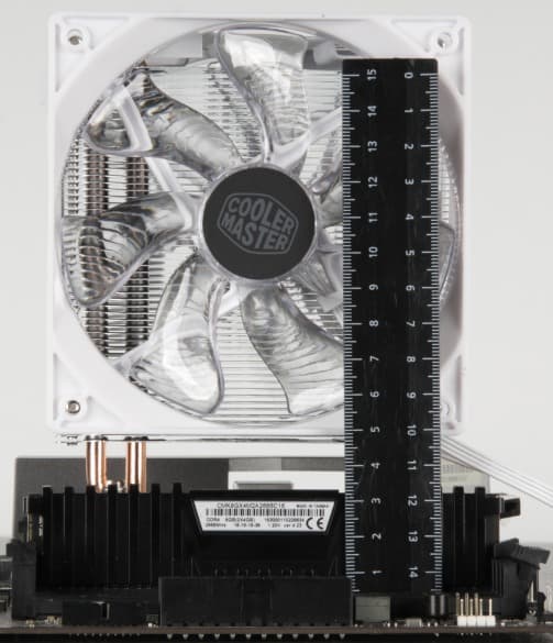 Глубина радиатора у кулеров AeroCool и Thermalright достаточно мала, чтобы при установленном вентиляторе не перекрывался ближайший разъем для модуля памяти. В случае be quiet! глубина радиатора большая, но сам он сдвинут вглубь, поэтому перекрытия все равно нет. В случае Cooler Master вентилятор в принципе может мешать установке в ближний разъем модулей памяти с высокими и толстыми радиаторами, но не обязательно, так как на 1 мм (а больше и не нужно) модуль может отжаться рамкой вентилятора. Если такой вариант неприемлем, то максимальная высота модуля памяти в ближайших разъемах составляет 48 мм (0 на линейке совпадает с нижней точкой модуля памяти):